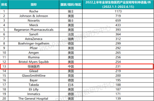 近日,全球专利数据库incoPat创新指数研究中心发布全球生物医药发明专利TOP100榜单,AG真人医药以上半年231件发明专利申请量位列榜单第13名,是唯一一家进入TOP20的中国药企。